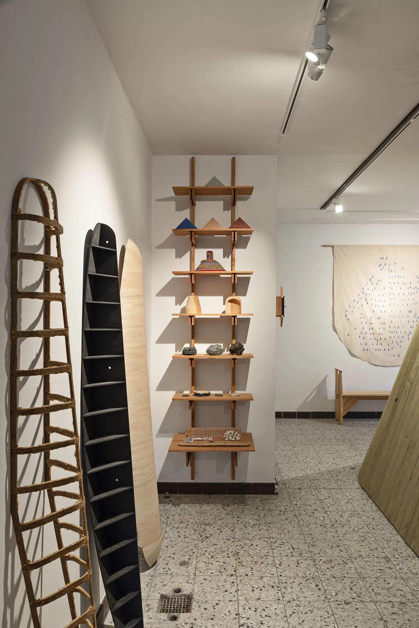 I dialog med de skabte rum indgår række objekter i træ, der befinder sig i et felt mellem hverdagen og det ophøjede. Former der kan give associationer til både, hylstre eller kroppe. Nogle fremstår tunge og lukkede, andre åbne og næsten skeletagtige, hvor konstruktionen træder frem. De taler sammen med den rumlige konstruktion uden at spejle den direkte.