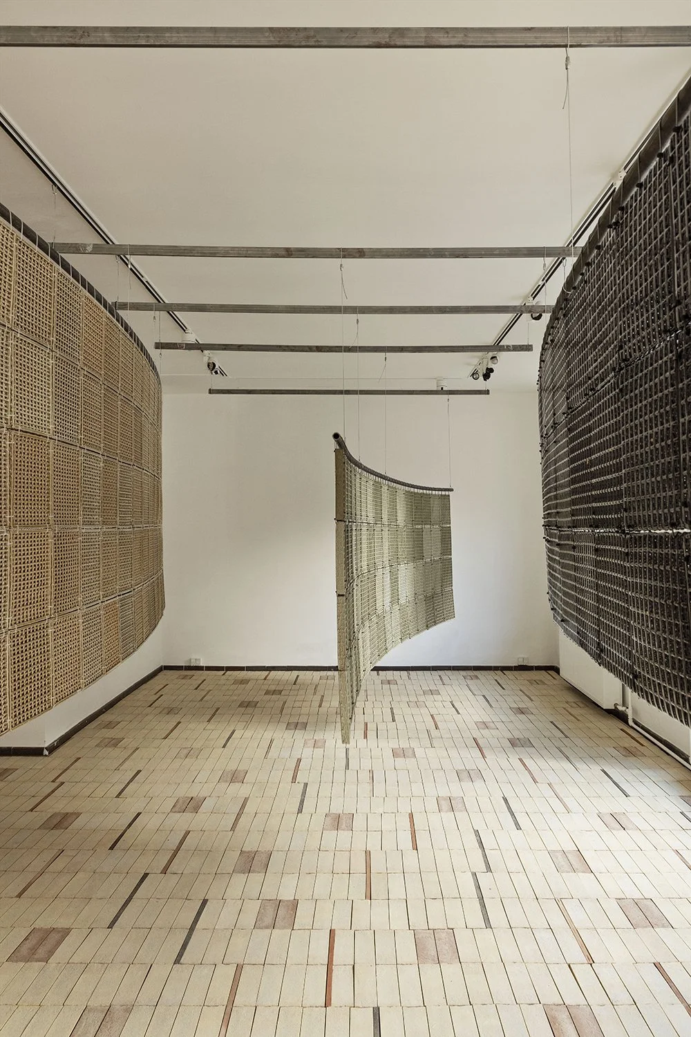 WEAVING EARTH er Ronco & Dorigos første samarbejde om værker til serieproduktion. Udstillingens keramiske objekter er udviklet under duoens residency på Terraformae, forskningscentret for den historiske italienske terracottafabrik S. Anselmo, der producerer tegl af høj kvalitet. Terracotta er lavtbrændt ler og betyder “brændt jord”.